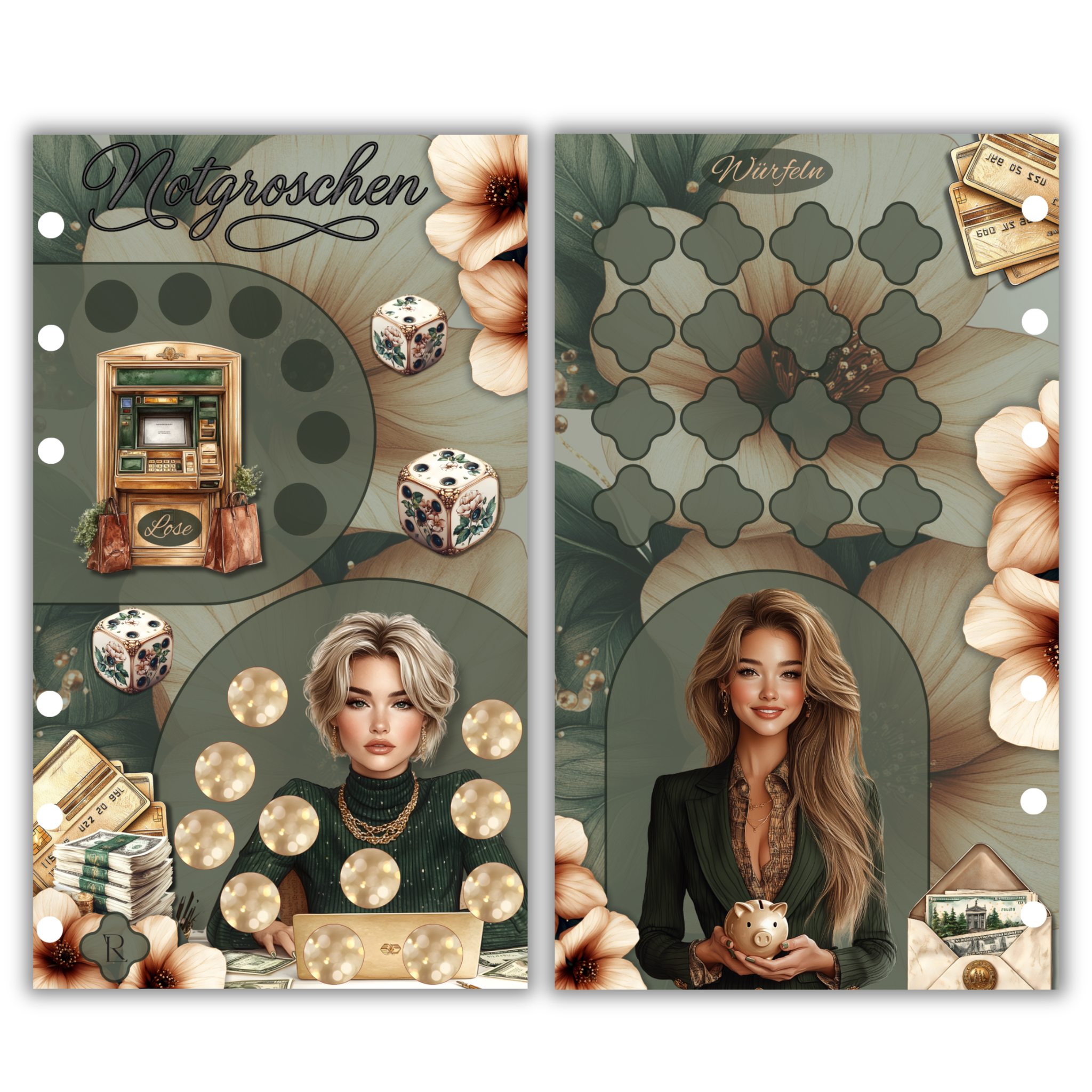 Verwandle das Sparen in ein spannendes Erlebnis! Mit dieser wunderschönen Notgroschen Einheftchallenge als Kombichallenge im eleganten Salbeigrün-Design macht Geldsparen richtig Spaß.